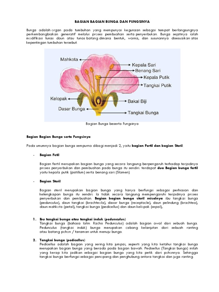Bagian bunga add to my workbooks (0) download file pdf embed in my website or blog Oleh itu disebut dengan kelompok bunga tidak lengkap. Brakte letaknya pada bagian luar bunga. Pada beberapa bunga juga ada bagian lain seperti tangkai bunga, dasar bunga, bakal biji dan daun pelindung. Secara umum, bunga tersusun dari 4 bagian utama yaitu bagian mahkota, kelopak bunga, benang sari dan bagian putik.